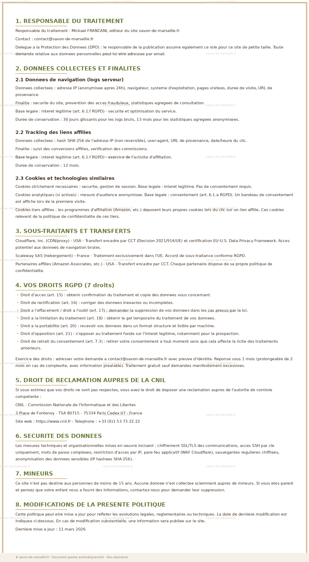 Conformement au Reglement General sur la Protection des Donnees (RGPD - Reglement UE 2016/679) et a la loi Informatique et Libertes, notre politique de traitement des donnees personnelles est presentee ci-dessous.